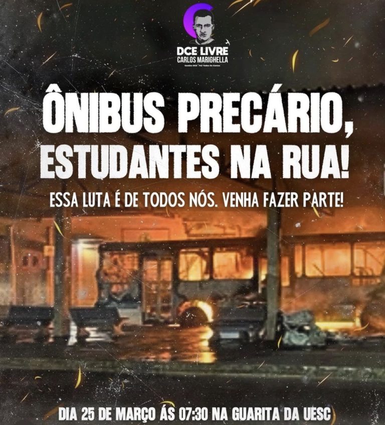 Estudantes organizam um ato nesta quarta-feira, 25 de março, em frente à guarita da Universidade Estadual de Santa Cruz, em Ilhéus, para denunciar as condições do transporte público que atende a comunidade acadêmica. A mobilização está marcada para as 7h30 e reúne universitários que enfrentam diariamente dificuldades para chegar às aulas.
